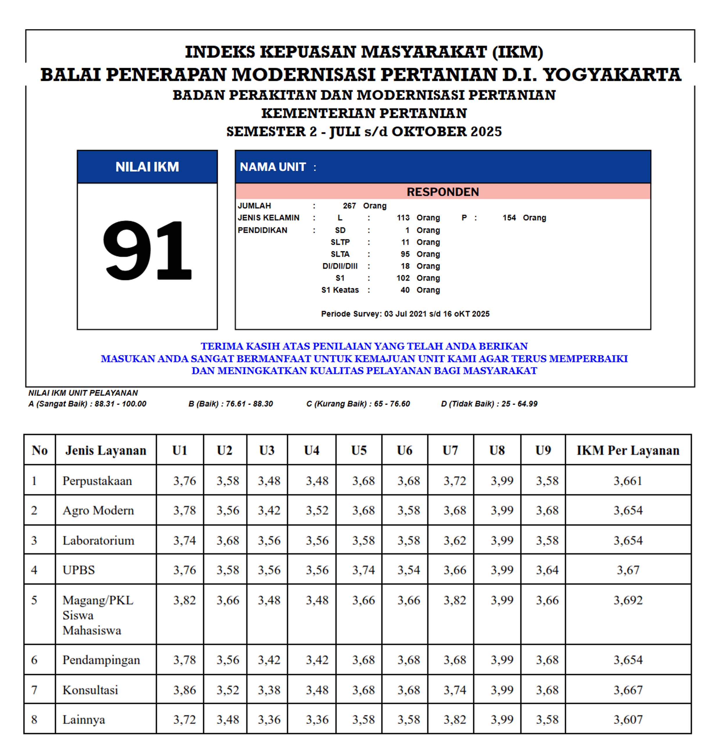 Peningkatan kualitas pelayanan publik bertujuan untuk meningkatkan kualitas pelayanan publik pada lingkup Kementerian Pertanian sesuai kebutuhan dan harapan masyarakat. berikut merupakan capaian Indeks Kepuasan Masyarakat (IKM) berdasarkan pasa Survei Kepuasan Masyarakat (SKM) terhadap layanan di BRMP D.I. Yogyakarta sebagai bagian dari kementerian pertanian.