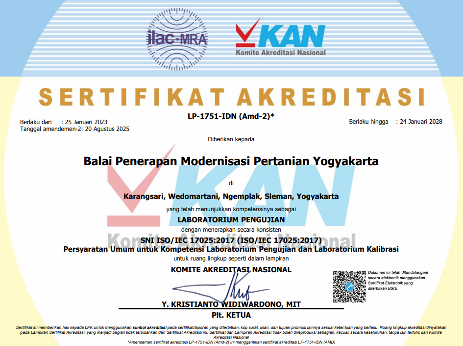 Balai Penerapan Modernisasi Pertanian Daerah Istimewa Yogyakarta (BRMP DIY) melaksanakan tugas pokok dan fungsinya dengan dukungan SDM serta sarana prasarana yang memadai. Salah satu sarana yang dimiliki adalah Laboratorium berstandar internasional (ISO) dengan sertifikat ISO/IEC 17025:2017 yang diterbitkan oleh Komite Akreditasi Nasional (KAN) dengan nomor sertifikat LP-1751-IDN (Amd 1).*